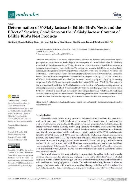 科技創(chuàng)新是產業(yè)發(fā)展的重要源泉和動力。多年來,燕之屋堅持傳承中國滋補文化的同時,結合現代科研技術深入研究,充分挖掘燕窩的營養(yǎng)價值及功效?,F代研究發(fā)現,“燕窩富含蛋白質、氨基酸、唾液酸和無機元素等,具有抗氧化、改善免疫、抑制血凝、調節(jié)腸道菌群等功效(來自:白偉娟等.《燕窩成分及功效研究進展》,2020)。”在燕之屋燕窩研究院科研團隊新近發(fā)布的研究成果中,基于開創(chuàng)性地建立的燕窩中3'-唾液酸乳糖的LC-MS/MS測定方法,及兩年的跟蹤研究發(fā)現3'-唾液酸乳糖作為一種更容易吸收的唾液酸形態(tài),適當的燉煮有助于燕窩中的唾液酸向更易吸收的3'-唾液酸乳糖的形態(tài)轉化。研究表明,“碗燕產品中3'-唾液酸乳糖含量顯著高于家庭燉煮燕窩(100℃ 30min)(來自:國際權威期刊《Molecules》,Determination of 3'-Sialyllactose in Edible Bird's Nests and the Effect of Stewing Conditions on the 3'-Sialyllactose Content of Edible Bird's Nest Products)。”如燕之屋旗下高端燕窩品牌碗燕飛天款的3'-唾液酸乳糖含量相對于于燉煮燕窩高達20余倍,表明燕之屋專利燉煮工藝(專利號:ZL201410393800.4 ;專利名稱:一種速食燕窩軟罐頭的制作方法)能夠激發(fā)燕窩的營養(yǎng)活性,提升燕窩產品的營養(yǎng)價值(來自:燕之屋燕窩研究院,碗燕產品五維營養(yǎng)分析報告)。”此外,燕之屋燕窩研究院科研團隊一直以來燕之屋始終堅持走“研發(fā)立企、創(chuàng)新興企”之路,基于研究成果不斷對產品進行升級和創(chuàng)新,致力于為消費者打造更為科學、營養(yǎng)、健康的產品。截止至2023年8月1日,燕之屋發(fā)表論文共計44篇,其中SCI 11篇。