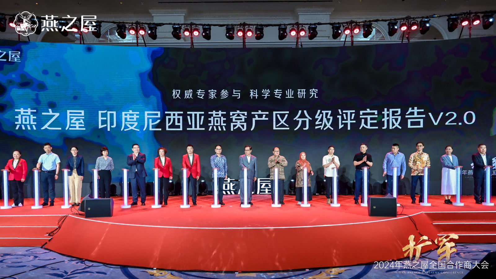 隨后,印度尼西亞駐華大使周浩黎,印度尼西亞動(dòng)植物檢疫標(biāo)準(zhǔn)檢驗(yàn)中心主任斯利揚(yáng)托,廈門海關(guān)技術(shù)中心、國家燕窩及燕窩制品檢測(cè)重點(diǎn)實(shí)驗(yàn)室主任徐敦明,印度尼西亞動(dòng)植物檢疫標(biāo)準(zhǔn)檢驗(yàn)中心研究員海爾米,印度尼西亞燕窩協(xié)會(huì)養(yǎng)護(hù)部部長(zhǎng)安東,印度尼西亞燕窩協(xié)會(huì)國際貿(mào)易部副部長(zhǎng)何文輝,江南大學(xué)未來食品科學(xué)中心鐘芳教授、陳茂深教授,華南理工大學(xué)食品科學(xué)與工程學(xué)院任嬌艷教授,印度尼西亞027工廠董事長(zhǎng)魯?shù)希《饶嵛鱽?04工廠普爾沃蘇特里斯諾,印度尼西亞014工廠露西亞娜,燕之屋執(zhí)行董事、副董事長(zhǎng)鄭文濱,燕之屋執(zhí)行董事、總裁李有泉,燕之屋董事、副總經(jīng)理、供應(yīng)鏈中心總經(jīng)理黃丹艷,燕之屋副總經(jīng)理、研發(fā)技術(shù)總監(jiān)范群艷,燕之屋供應(yīng)鏈中心總監(jiān)魏溦等領(lǐng)導(dǎo)和嘉賓共同啟動(dòng)發(fā)布《燕之屋印度尼西亞燕窩產(chǎn)區(qū)分級(jí)評(píng)定報(bào)告V2.0》。這標(biāo)志著燕之屋在專業(yè)化、標(biāo)準(zhǔn)化、高質(zhì)量發(fā)展上更進(jìn)一步。