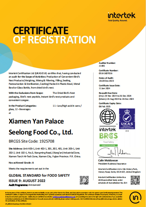 圖:燕之屋獲得BRC食品安全全球標(biāo)準(zhǔn)、IFS國際食品標(biāo)準(zhǔn)認(rèn)證