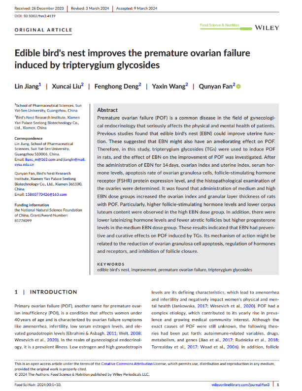 近日,燕之屋在食品科學(xué)領(lǐng)域取得了重大突破,其開(kāi)展的一項(xiàng)題為“Edible bird's nest improves the premature ovarian failure induced by tripterygium glycosides”的研究成果被食品科學(xué)領(lǐng)域國(guó)際知名SCI收錄期刊《Food Science & Nutrition》正式收錄??茖W(xué)研究表明,燕窩對(duì)免疫制劑雷公藤多苷誘導(dǎo)的卵巢早衰有一定的預(yù)防和治療作用。其作用機(jī)制可能與減少卵巢顆粒細(xì)胞凋亡、調(diào)節(jié)激素和受體、抑制卵泡閉合有關(guān)。