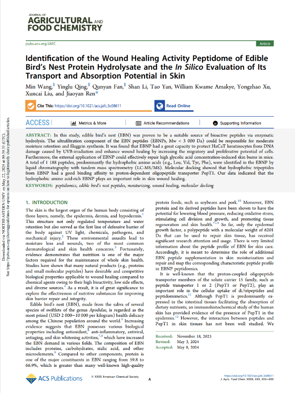 此次燕之屋“Identification of the Wound Healing Activity Peptidome of Edible Bird's Nest Protein Hydrolysate and the In Silico Evaluation of Its Transport and Absorption Potential in Skin”科研成果被食品科學(xué)領(lǐng)域國際權(quán)威期刊《Journal of Agricultural and Food Chemistry》收錄,進(jìn)一步彰顯燕之屋學(xué)術(shù)實(shí)力與科研水平。該科研成果具有科學(xué)性、創(chuàng)新性和前沿性,不僅展示了燕之屋對(duì)燕窩肽的研究和理解深度,更促進(jìn)燕窩肽的開發(fā)和利用,將推動(dòng)燕窩行業(yè)的科學(xué)研究和產(chǎn)品創(chuàng)新。燕之屋持續(xù)深耕科研工作,未來也將不斷挖掘、開發(fā)燕窩營養(yǎng)價(jià)值,為國民健康高品質(zhì)生活助力。