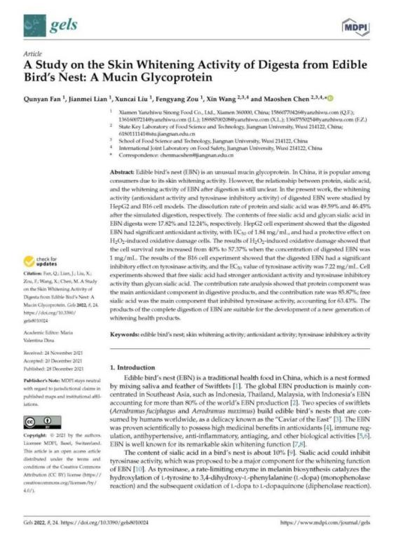 圖:燕之屋燕窩研究院研究論文被國際權(quán)威SCI收錄期刊