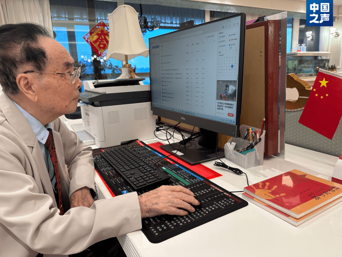 圖:95歲的侯云德每天在電腦前學(xué)習(xí)新知識和進行學(xué)術(shù)創(chuàng)作