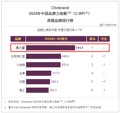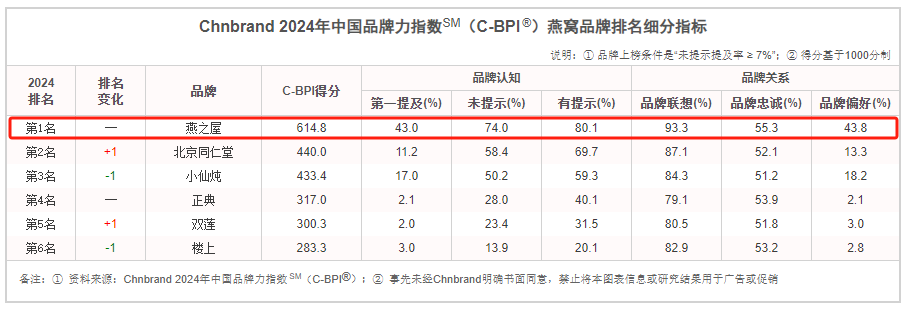 圖:燕之屋榮獲2024年中國(guó)品牌力指數(shù)燕窩品類排行榜榜首