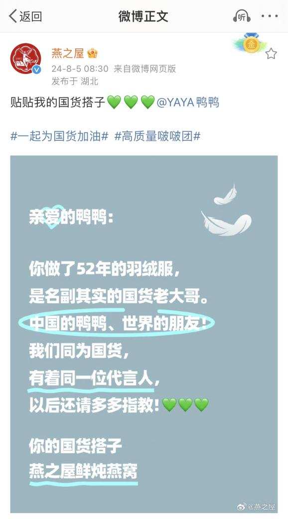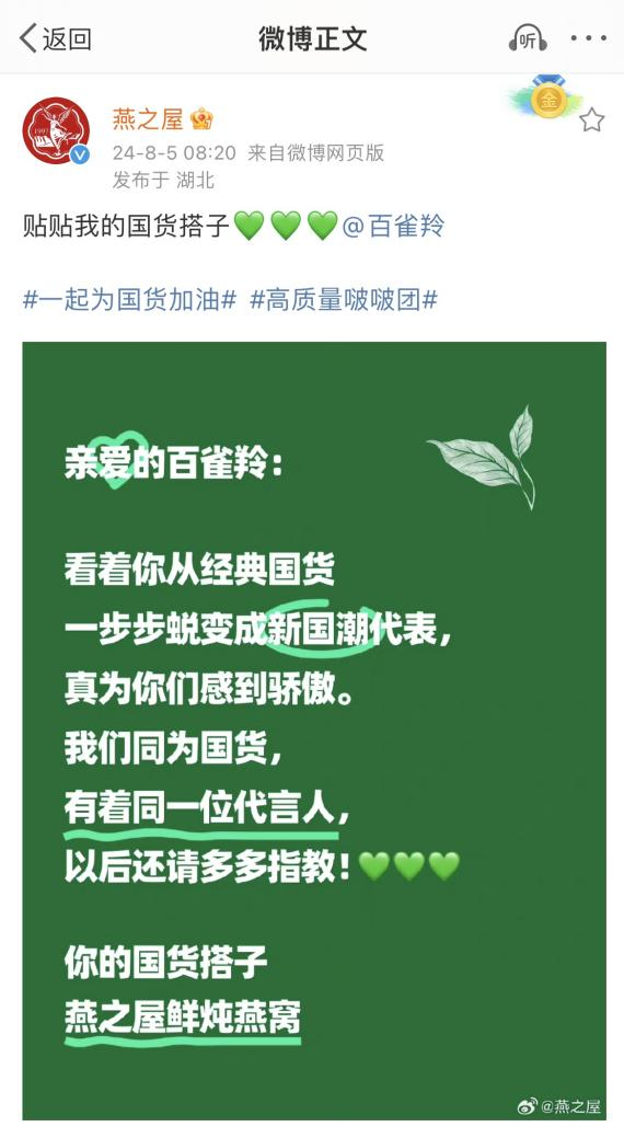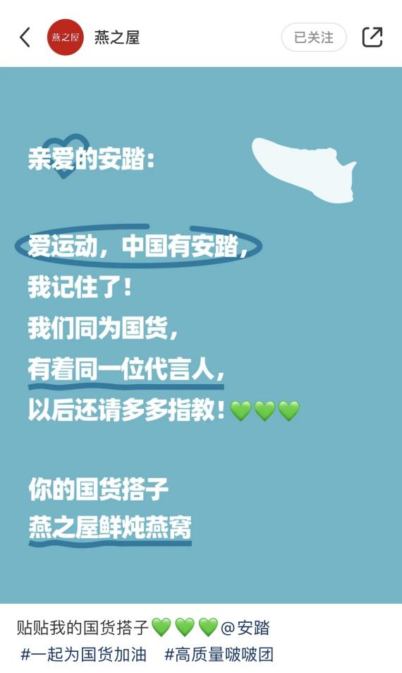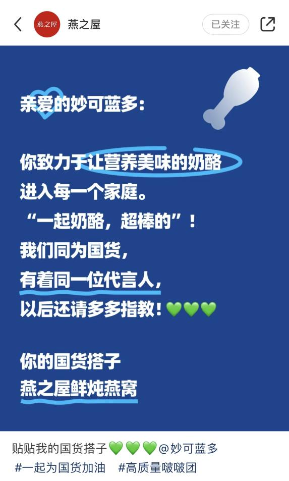 今年5月,燕之屋正式官宣王一博成為全球品牌代言人。二者實力聯(lián)袂,頂峰相交,為品牌注入澎湃活力。生日當(dāng)天,燕之屋聯(lián)合百雀羚、鴨鴨、妙可藍(lán)多、安踏、臺鈴、林氏家居、噸噸、Baseus倍思、阿道夫、蕉內(nèi)、C咖、庫迪咖啡共12家國貨品牌,于微博、小紅書平臺進(jìn)行互動,并攜手王一博亮相深圳希爾頓大屏和北京三里屯通盈中心大屏,其陽光、自信的姿態(tài),將燕之屋“美與健康”的品牌理念與精神完美詮釋。