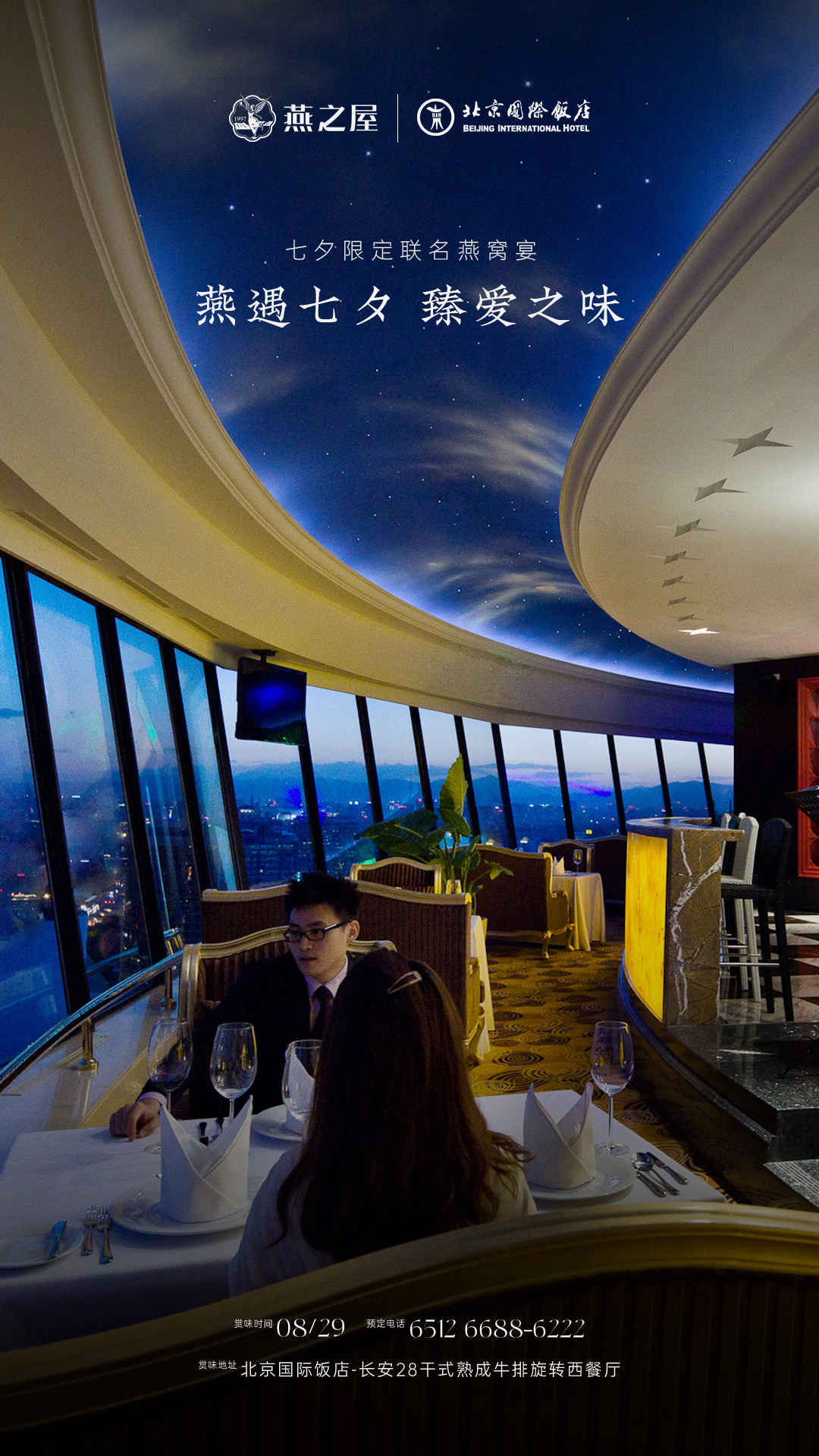 北京國際飯店長安28餐廳作為北京市中心高空360度環(huán)瞰京城盛景的旋轉(zhuǎn)餐廳,以其獨(dú)特的奢華與雅致并存的裝修風(fēng)格,成為京城高端餐飲場所。604㎡餐廳空間、100個(gè)精致餐位,3間多功能廳房,配合專業(yè)的服務(wù)團(tuán)隊(duì),為每位賓客提供尊貴的用餐體驗(yàn)。燕之屋27年專注高品質(zhì)燕窩,始終堅(jiān)持“源于天然,美與健康”的理念,以創(chuàng)新科研賦能上乘品質(zhì),連續(xù)九年高端燕窩全國銷售第一①。此次合作是云端視野與輕奢品味的雙重尊享,正如每一對(duì)相約七夕的甜蜜愛侶。
