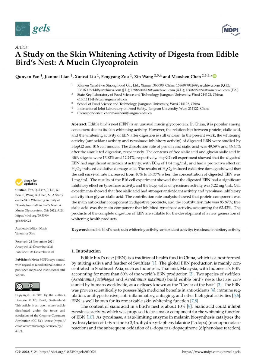 在2021年12月28日,燕之屋燕窩研究院和江南大學(xué)食品科學(xué)與技術(shù)國家重點(diǎn)實(shí)驗(yàn)室攜手完成并刊登了專業(yè)研究成果《食用燕窩消化物的皮膚美白活性研究:一種黏蛋白糖蛋白》,并發(fā)布于權(quán)威學(xué)術(shù)性期刊《gels》。