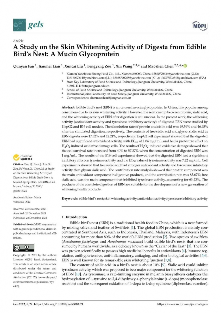 在2021年12月28日,燕之屋燕窩研究院和江南大學食品科學與技術國家重點實驗室攜手完成并刊登了專業(yè)研究成果《食用燕窩消化物的皮膚美白活性研究:一種黏蛋白糖蛋白》,并發(fā)布于權威學術性期刊《gels》。此次研究實驗通過HepG2和B16細胞模型研究了燕窩消化物(酶解物)的美白活性(抗氧化活性和酪氨酸酶抑制活性)。實驗表明:“消化后的EBN具有顯著的抗氧化活性,對酪氨酸酶活性有顯著的抑制作用;從燕窩消化物(酶解物)中不同成分的貢獻率分析表明,燕窩肽是其中主要的抗氧化成分,貢獻率為85.87%,適合開發(fā)新一代美白保健品。”